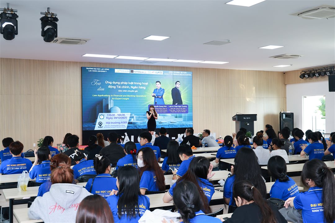 Chiều ngày 20/12/2025, tại Hội trường A301 – Cơ sở 1, Trường Đại học Lạc Hồng, Khoa Tài chính – Kế toán đã tổ chức thành công Tọa đàm với chủ đề “Ứng dụng pháp luật trong hoạt động Tài chính – Ngân hàng: Góc nhìn chuyên gia”, thu hút sự tham dự của đông đảo giảng viên, sinh viên ngành Tài chính – Ngân hàng cùng các khách mời chuyên môn.
