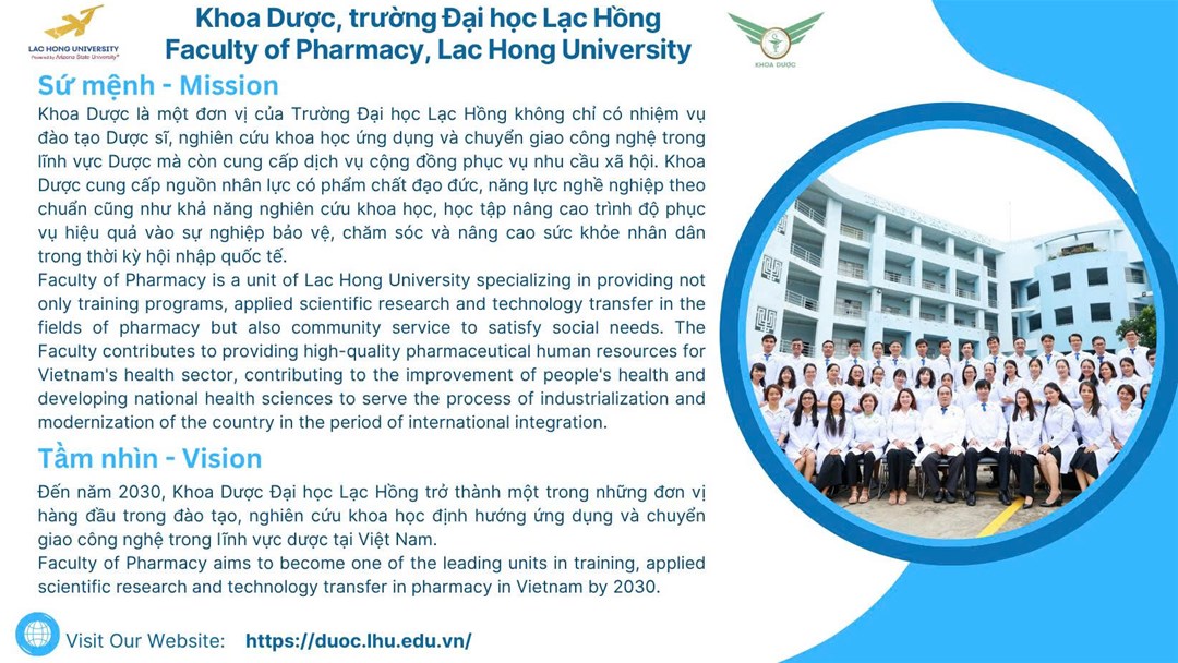 Faculty of Pharmacy is a unit of Lac Hong University specializing in providing not only training programs, applied scientific research and technology transfer in the fields of pharmacy but also community service to satisfy social needs. The Faculty contributes to providing high-quality pharmaceutical human resources for Vietnam's health sector, contributing to the improvement of people's health and developing national health sciences to serve the process of industrialization and modernization of the country in the period of international integration