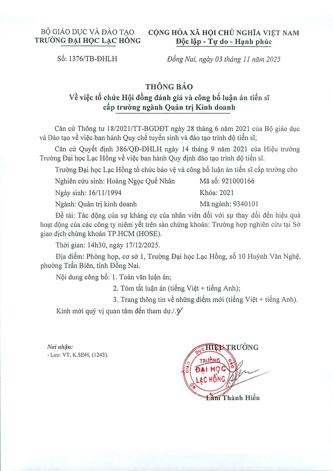 Thông báo lịch bảo vệ luận án tiến sĩ cấp Trường ngành Quản trị kinh doanh tháng 12 năm 2025